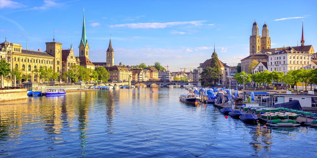 Zürich ligger väldigt vackert vid den norra änden av Zürichsjön och delas i två delar av floden Limmat. I den pittoreska östra delen hittar du mängder av caféer och små butiker längs kullerstensgatorna och överallt tronar tvillingtornen på katedralen Grossmünster som daterar från 1000-talet. Den västra delen är den äldsta delen av staden och ironiskt nog är det här du hittar de stora modevaruhusen och kontoren. Några steg från en annan historisk kyrka, Fraumünster, ligger en av Europas främsta shoppinggator och symbol för Schweiz rikedomar: Bahnhofstrasse som följer den gamla stadsmurens bana och där det vimlar av juvelerare och modebutiker. Det är här Zürichborna samlas för att promenera, (fönster-)shoppa och umgås, och vad du än är ute efter hittar du det här.